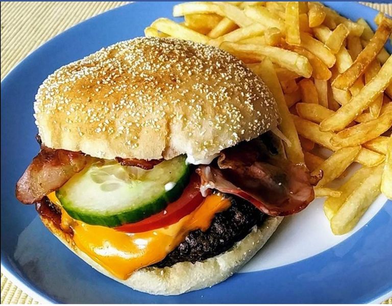 Burgerbuns, Käse, Bacon, Soßen und Toppings je nach Vorlieben